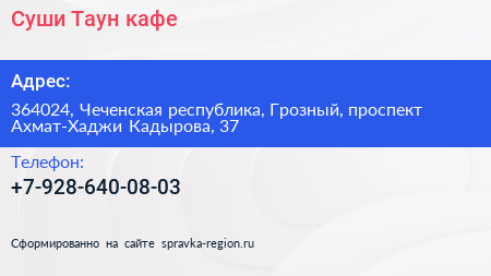Суши Таун, кафе по адресу 364024, Чеченская республика, Грозный, проспект Ахмат-Хаджи Кадырова, 37 в дальнейшем Организация, размещена в следующих категориях: