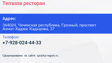 Terrassa, ресторан по адресу 364024, Чеченская республика, Грозный, проспект Ахмат-Хаджи Кадырова, 37 в дальнейшем Организация, размещена в следующих категориях: