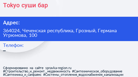 Tokyo, суши-бар по адресу 364024, Чеченская республика, Грозный, Германа Угрюмова, 100 в дальнейшем Организация, размещена в следующих категориях: