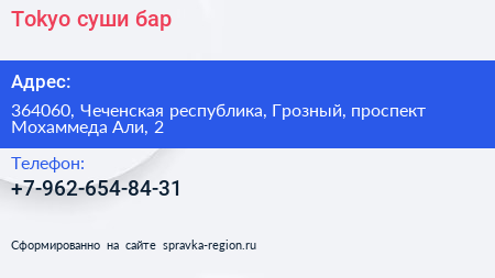 Tokyo, суши-бар по адресу 364060, Чеченская республика, Грозный, проспект Мохаммеда Али, 2 в дальнейшем Организация, размещена в следующих категориях:
