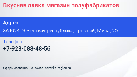 Вкусная лавка, магазин полуфабрикатов по адресу 364024, Чеченская республика, Грозный, Мира, 20 в дальнейшем Организация, размещена в следующих категориях: