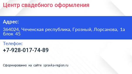 Центр свадебного оформления по адресу 364024, Чеченская республика, Грозный, Лорсанова, 1а блок 45 в дальнейшем Организация, размещена в следующих категориях: