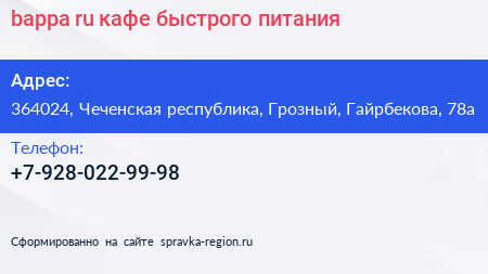 bappa.ru, кафе быстрого питания по адресу 364024, Чеченская республика, Грозный, Гайрбекова, 78а в дальнейшем Организация, размещена в следующих категориях: