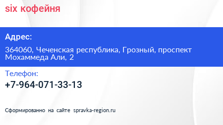 six, кофейня по адресу 364060, Чеченская республика, Грозный, проспект Мохаммеда Али, 2 в дальнейшем Организация, размещена в следующих категориях: