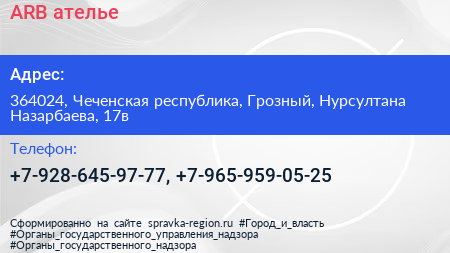 ARB, ателье по адресу 364024, Чеченская республика, Грозный, Нурсултана Назарбаева, 17в в дальнейшем Организация, размещена в следующих категориях: