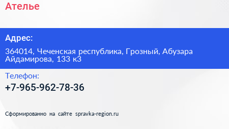 Ателье по адресу 364014, Чеченская республика, Грозный, Абузара Айдамирова, 133 к3 в дальнейшем Организация, размещена в следующих категориях: