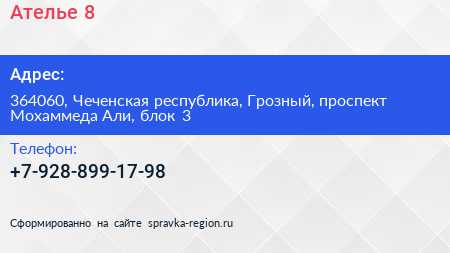 Ателье №8 по адресу 364060, Чеченская республика, Грозный, проспект Мохаммеда Али, блок 3 в дальнейшем Организация, размещена в следующих категориях: