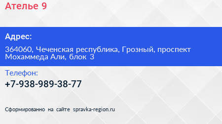 Ателье №9 по адресу 364060, Чеченская республика, Грозный, проспект Мохаммеда Али, блок 3 в дальнейшем Организация, размещена в следующих категориях: