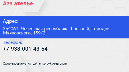Аза, ателье по адресу 364061, Чеченская республика, Грозный, Городок Маяковского, 159/2 в дальнейшем Организация, размещена в следующих категориях: