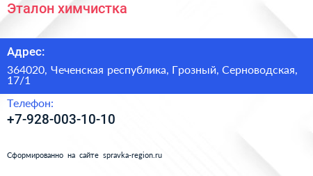Эталон, химчистка по адресу 364020, Чеченская республика, Грозный, Серноводская, 17/1 в дальнейшем Организация, размещена в следующих категориях: