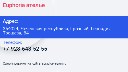 Euphoria, ателье по адресу 364024, Чеченская республика, Грозный, Геннадия Трошева, 84 в дальнейшем Организация, размещена в следующих категориях: