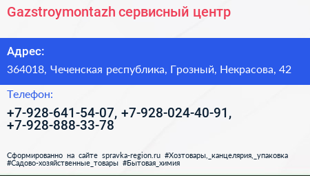Gazstroymontazh, сервисный центр по адресу 364018, Чеченская республика, Грозный, Некрасова, 42 в дальнейшем Организация, размещена в следующих категориях: