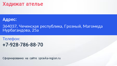 Хадижат, ателье по адресу 364037, Чеченская республика, Грозный, Магомеда Нурбагандова, 25а в дальнейшем Организация, размещена в следующих категориях: