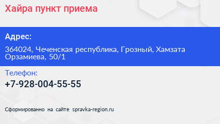 Хайра, пункт приема по адресу 364024, Чеченская республика, Грозный, Хамзата Орзамиева, 50/1 в дальнейшем Организация, размещена в следующих категориях: