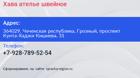 Хава, ателье швейное по адресу 364029, Чеченская республика, Грозный, проспект Кунта-Хаджи Кишиева, 31 в дальнейшем Организация, размещена в следующих категориях: