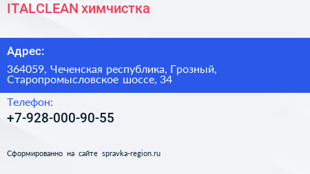 ITALCLEAN, химчистка по адресу 364059, Чеченская республика, Грозный, Старопромысловское шоссе, 34 в дальнейшем Организация, размещена в следующих категориях: