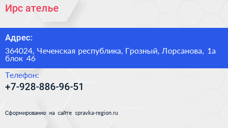 Ирс, ателье по адресу 364024, Чеченская республика, Грозный, Лорсанова, 1а блок 46 в дальнейшем Организация, размещена в следующих категориях:
