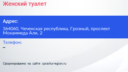 Женский туалет по адресу 364060, Чеченская республика, Грозный, проспект Мохаммеда Али, 2 в дальнейшем Организация, размещена в следующих категориях: