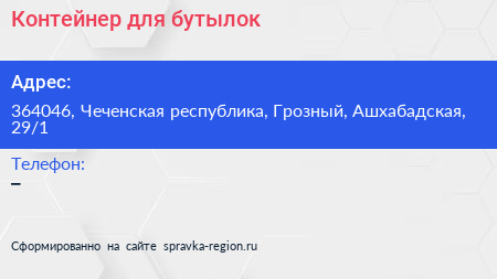 Контейнер для бутылок по адресу 364046, Чеченская республика, Грозный, Ашхабадская, 29/1 в дальнейшем Организация, размещена в следующих категориях:
