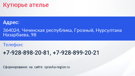 Кутюрье, ателье по адресу 364024, Чеченская республика, Грозный, Нурсултана Назарбаева, 98 в дальнейшем Организация, размещена в следующих категориях:
