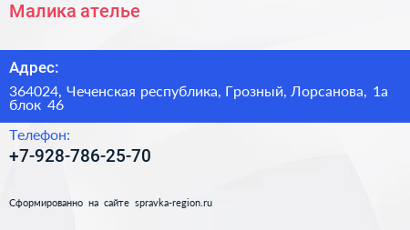 Малика, ателье по адресу 364024, Чеченская республика, Грозный, Лорсанова, 1а блок 46 в дальнейшем Организация, размещена в следующих категориях: