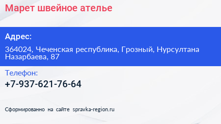 Марет, швейное ателье по адресу 364024, Чеченская республика, Грозный, Нурсултана Назарбаева, 87 в дальнейшем Организация, размещена в следующих категориях: