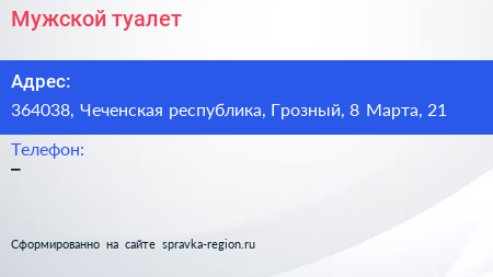 Мужской туалет по адресу 364038, Чеченская республика, Грозный, 8 Марта, 21 в дальнейшем Организация, размещена в следующих категориях: