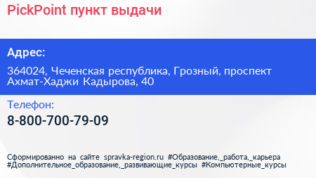 PickPoint, пункт выдачи по адресу 364024, Чеченская республика, Грозный, проспект Ахмат-Хаджи Кадырова, 40 в дальнейшем Организация, размещена в следующих категориях: