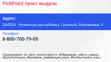 PickPoint, пункт выдачи по адресу 364024, Чеченская республика, Грозный, Мамакаева, 9 в дальнейшем Организация, размещена в следующих категориях: