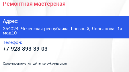 Ремонтная мастерская по адресу 364024, Чеченская республика, Грозный, Лорсанова, 1а мод10 в дальнейшем Организация, размещена в следующих категориях: