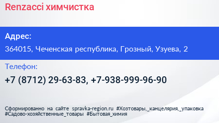Renzacci, химчистка по адресу 364015, Чеченская республика, Грозный, Узуева, 2 в дальнейшем Организация, размещена в следующих категориях: