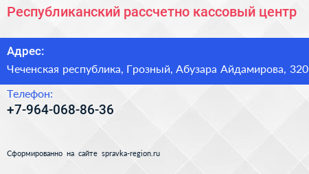 Республиканский рассчетно-кассовый центр по адресу Чеченская республика, Грозный, Абузара Айдамирова, 320 в дальнейшем Организация, размещена в следующих категориях: