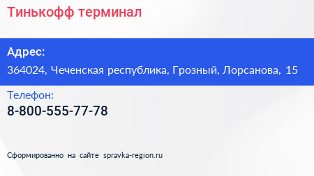 Тинькофф, терминал по адресу 364024, Чеченская республика, Грозный, Лорсанова, 15 в дальнейшем Организация, размещена в следующих категориях: