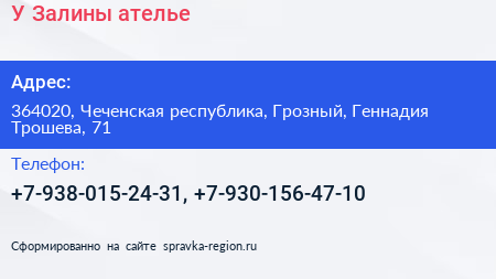 У Залины, ателье по адресу 364020, Чеченская республика, Грозный, Геннадия Трошева, 71 в дальнейшем Организация, размещена в следующих категориях: