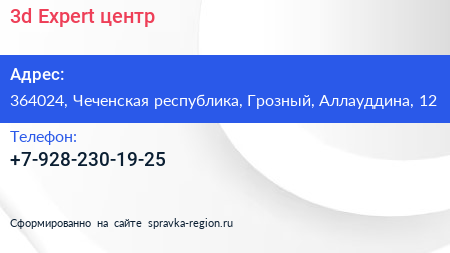 3d Expert, центр по адресу 364024, Чеченская республика, Грозный, Аллауддина, 12 в дальнейшем Организация, размещена в следующих категориях: