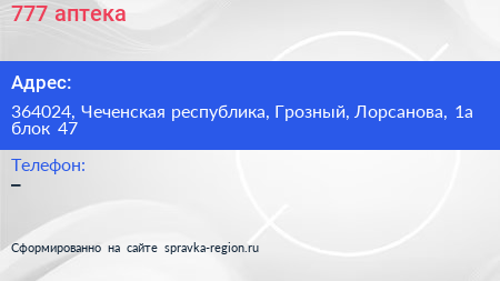 777, аптека по адресу 364024, Чеченская республика, Грозный, Лорсанова, 1а блок 47 в дальнейшем Организация, размещена в следующих категориях: