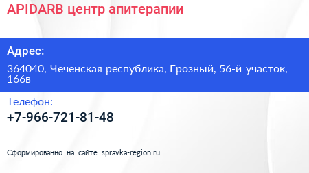APIDARB, центр апитерапии по адресу 364040, Чеченская республика, Грозный, 56-й участок, 166в в дальнейшем Организация, размещена в следующих категориях: