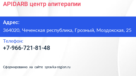APIDARB, центр апитерапии по адресу 364020, Чеченская республика, Грозный, Моздокская, 25 в дальнейшем Организация, размещена в следующих категориях: