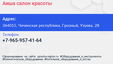 Аиша, салон красоты по адресу 364015, Чеченская республика, Грозный, Узуева, 28 в дальнейшем Организация, размещена в следующих категориях: