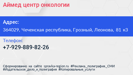 Аймед, центр онкологии по адресу 364029, Чеченская республика, Грозный, Леонова, 81 к3 в дальнейшем Организация, размещена в следующих категориях: