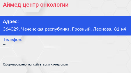 Аймед, центр онкологии по адресу 364029, Чеченская республика, Грозный, Леонова, 81 к4 в дальнейшем Организация, размещена в следующих категориях: