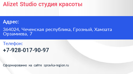 Alizet Studio, студия красоты по адресу 364024, Чеченская республика, Грозный, Хамзата Орзамиева, 7 в дальнейшем Организация, размещена в следующих категориях: