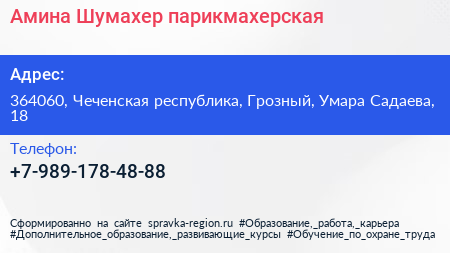 Амина Шумахер, парикмахерская по адресу 364060, Чеченская республика, Грозный, Умара Садаева, 18 в дальнейшем Организация, размещена в следующих категориях: