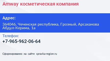 Amway, косметическая компания по адресу 364046, Чеченская республика, Грозный, Арсаханова Абдул-Керима, 1а в дальнейшем Организация, размещена в следующих категориях:
