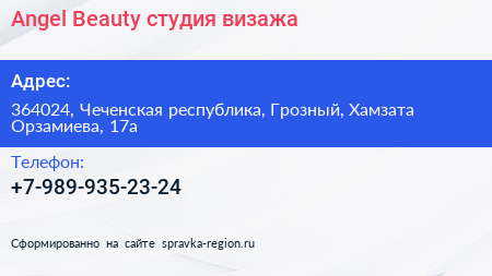 Angel Beauty, студия визажа по адресу 364024, Чеченская республика, Грозный, Хамзата Орзамиева, 17а в дальнейшем Организация, размещена в следующих категориях: