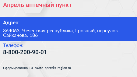 Апрель, аптечный пункт по адресу 364063, Чеченская республика, Грозный, переулок Сайханова, 186 в дальнейшем Организация, размещена в следующих категориях: