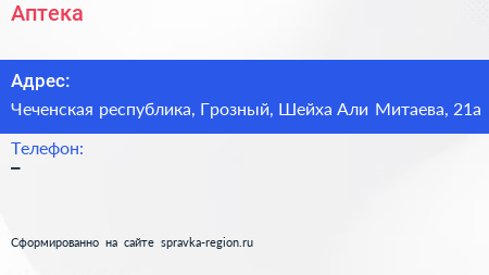 Аптека по адресу Чеченская республика, Грозный, Шейха Али Митаева, 21а в дальнейшем Организация, размещена в следующих категориях: