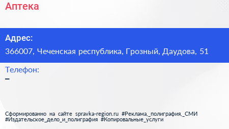 Аптека по адресу 366007, Чеченская республика, Грозный, Даудова, 51 в дальнейшем Организация, размещена в следующих категориях: