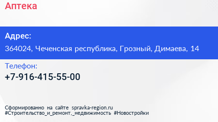 Аптека по адресу 364024, Чеченская республика, Грозный, Димаева, 14 в дальнейшем Организация, размещена в следующих категориях: