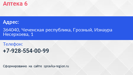 Аптека №6 по адресу 364040, Чеченская республика, Грозный, Изнаура Несерхоева, 1 в дальнейшем Организация, размещена в следующих категориях: